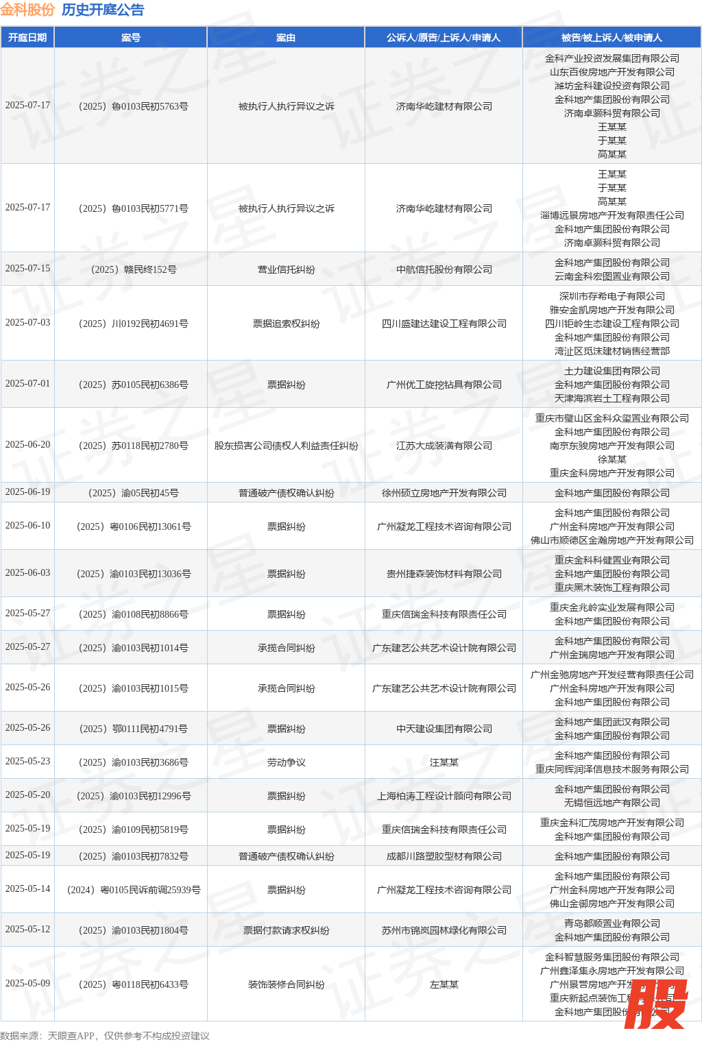 案号:(2025)苏0118民初2780号审理法院:南京市高淳区人民法院案由:股东损害公司债权人利益责任纠纷当事人信息: 原告/上诉人:江苏大成装潢有限公司 被告/被上诉人:重庆市璧山区金科众玺置业有限公司、金科地产集团股份有限公司、南京东骏房地产开发有限公司、徐某某、重庆金科房地产开发有限公司开庭日期:2025年6月20日根据统计,近一年内以金科地产集团股份有限公司为当事人的历史开庭公告有221则,其中案由为“票据纠纷”的公告以76则居首,其次为“票据追索权纠纷”有43则,“劳动争议”有15则。历史开庭公告(前20条)如下: